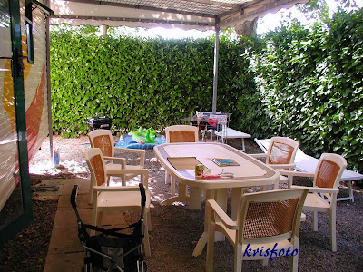 Dar ai tot confortul, bucatarie, baie, dormitoare separate, gradina, spatiu ingradit de gard viu (2m) , masa si scaune afara, barbecue, chestia aia pentru intins rufe (nu-mi vine in minte numele), sezlonguri, un vas mare cu flori la intrare. Bucataria are totul, de la lingurite, farfurii mici/mari, castroane, oale, cafetiera, ceaun pentru ceai, ustensile pentru gratare (nici acasa nu am tot ce aveam in camping!) presine, cutii pentru dus mancare (un set intreg de vreo 10 bucati!) frigider, congelator, cuptoare....totul si mai mult decat ne-am fi asteptat!